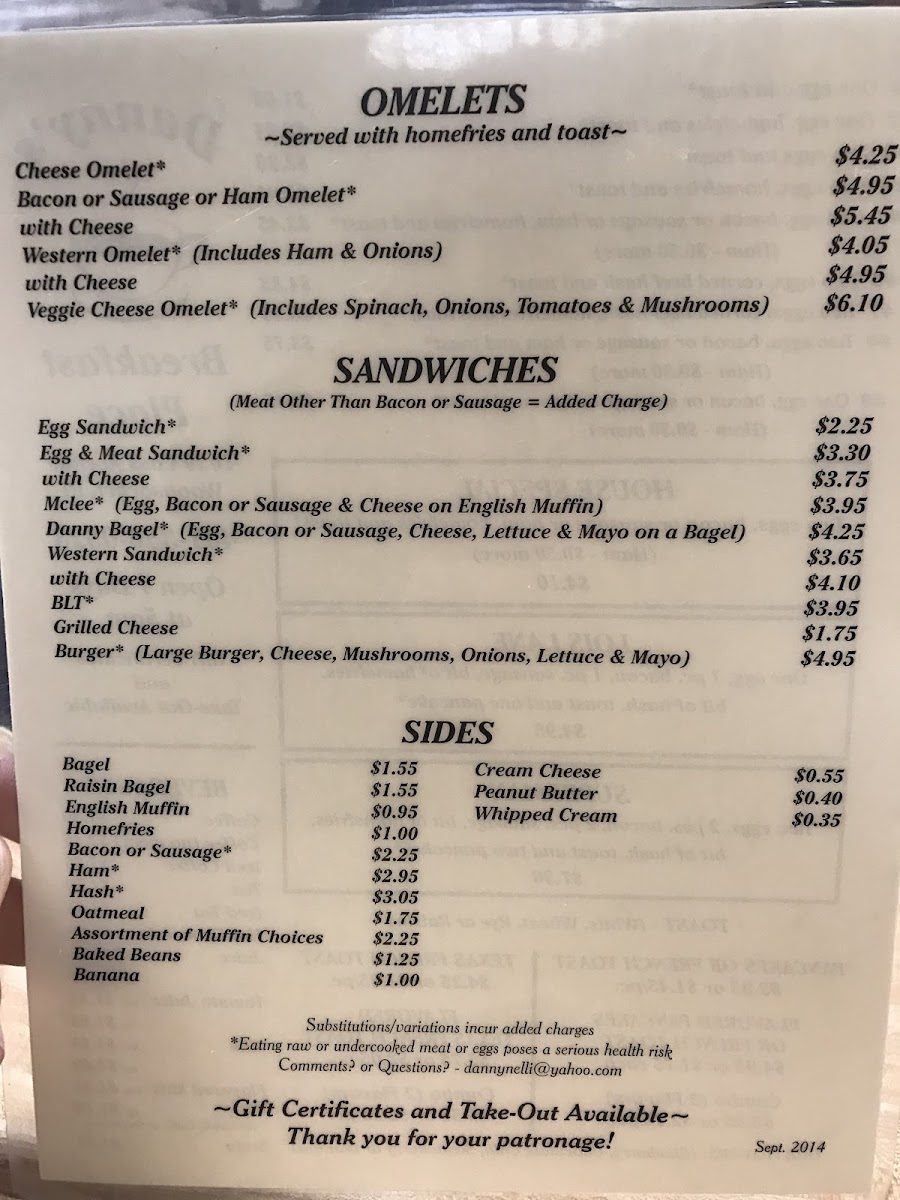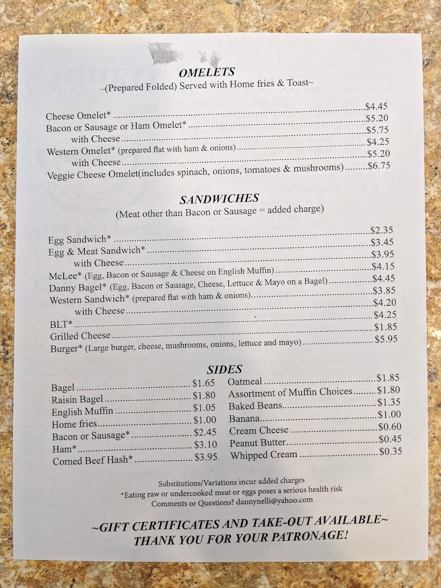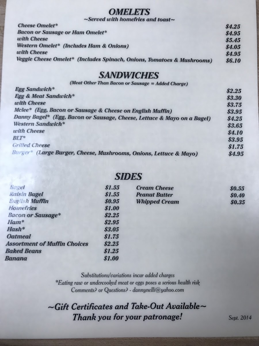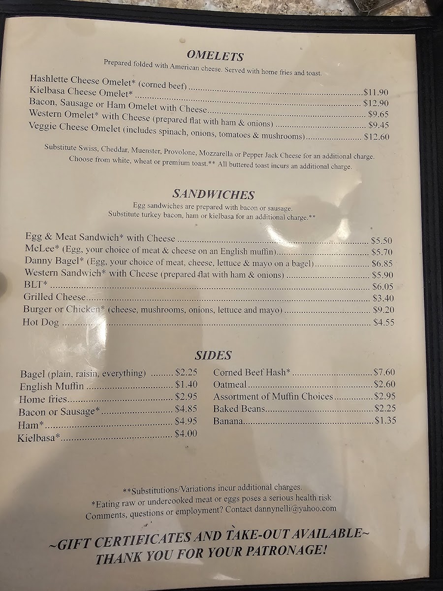 What sets Danny's apart is its cozy atmosphere and friendly vibe, making it a perfect spot to connect with locals over a hearty meal. The breakfast special, featuring two eggs, toast, home fries, and your choice of meat, exemplifies Dan's focus on generous portions and comfort food that you won't find replicated elsewhere.